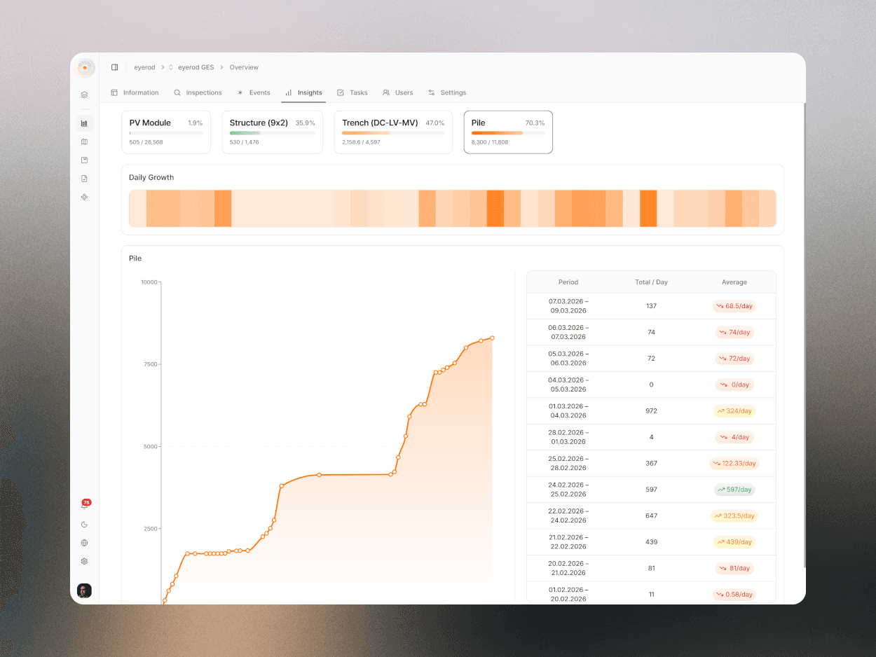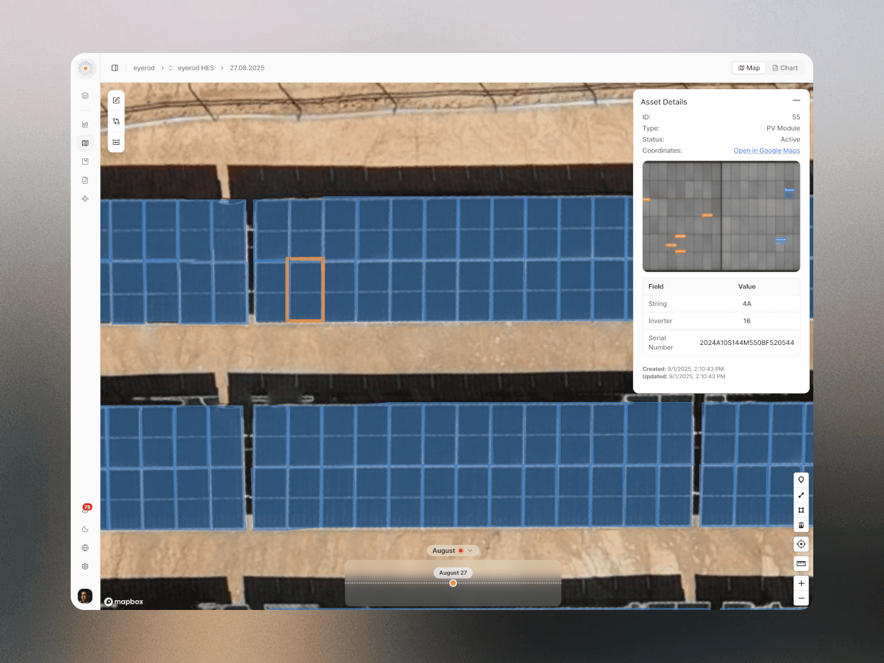 Asset Intelligence ile saha devreye alındıktan sonra santraldeki modülleri tek tek tespit ediyor, seri numaralarını konum bilgileriyle eşleştiriyor ve fiziksel varlıklarla dijital kayıtları aynı yapı içinde buluşturuyoruz. Termal analiz desteğiyle performans sapmalarını ve olası sorunları daha erken görünür hale getirirken; garanti durumu, bakım geçmişi ve panel bazlı kayıtları tek merkezde yönetilebilir hale getiriyoruz.